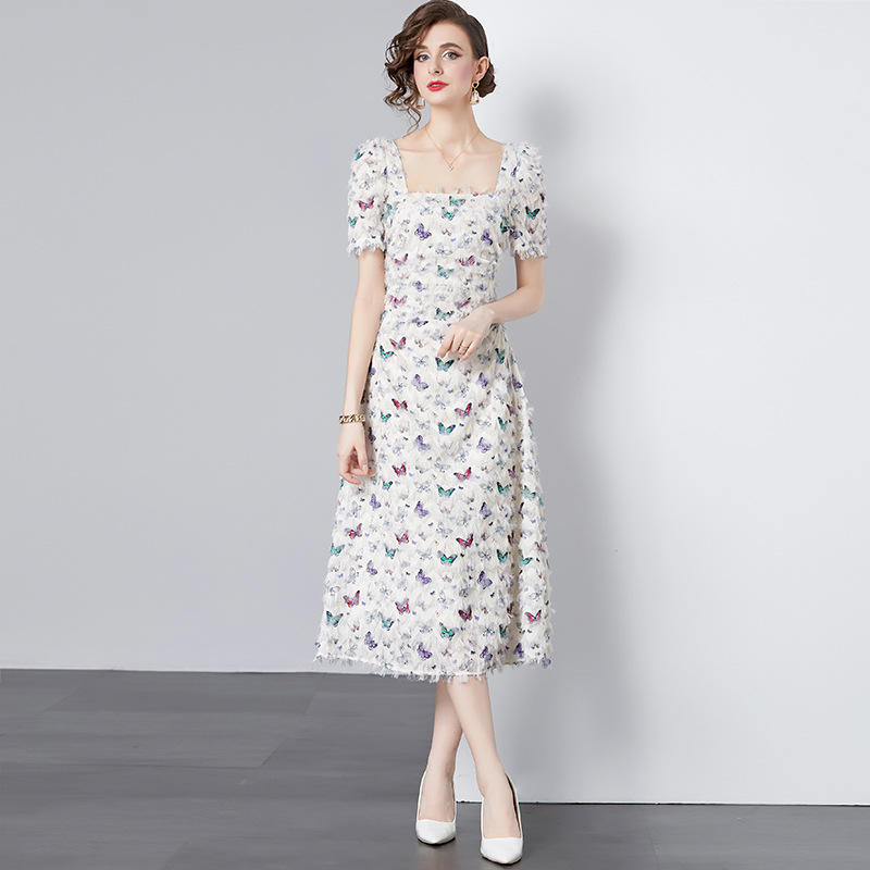 白いフランスの蝶のプリントの方襟は腰のワンピースの女性の夏の2024の新型の小さい大衆の日常のフリンジロングスカートを収めます。