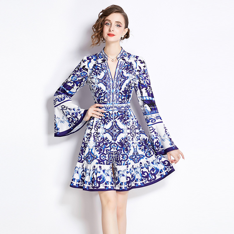 ファッションレトロvネックラッパ袖カーディガン多ボタンプリントワンピース