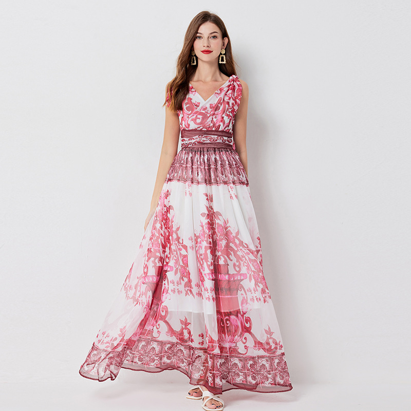 外国貿易輸出女装2024新型リゾート風デザイン感vネックプリント長袖ウエストワンピース