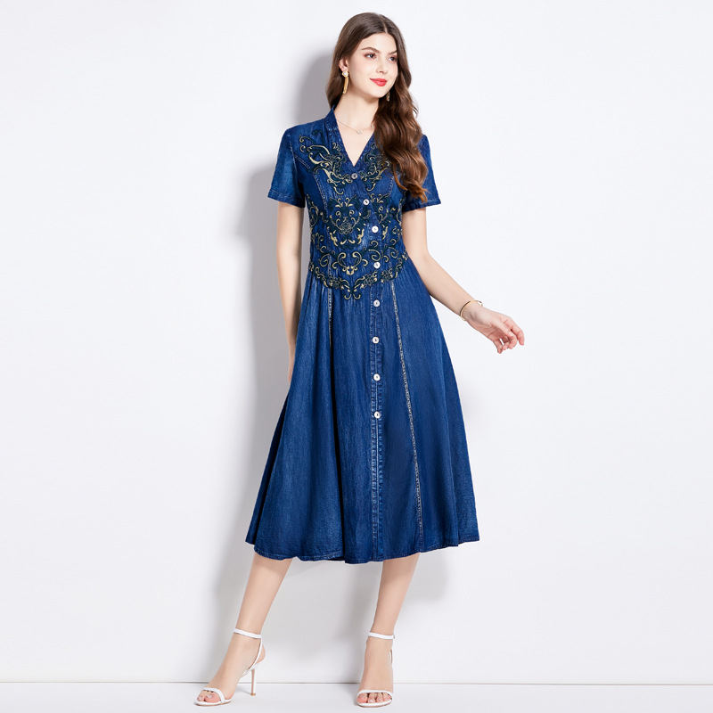 カーディガンvネックデニムロングスカート2024夏新作レトロ再加工刺繍腰を収めて痩せて見えるワンピース民族風a型