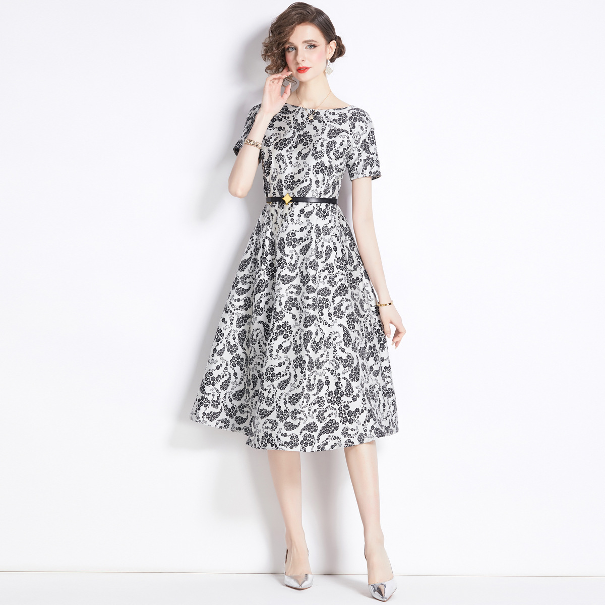 クロスボーダーの外国貿易の婦人服のフランス式の復古のジャカードのワンピースの女性の年齢を減らす気質は腰のa字の中で長いスカートを収めて腰のベルトを配合します。