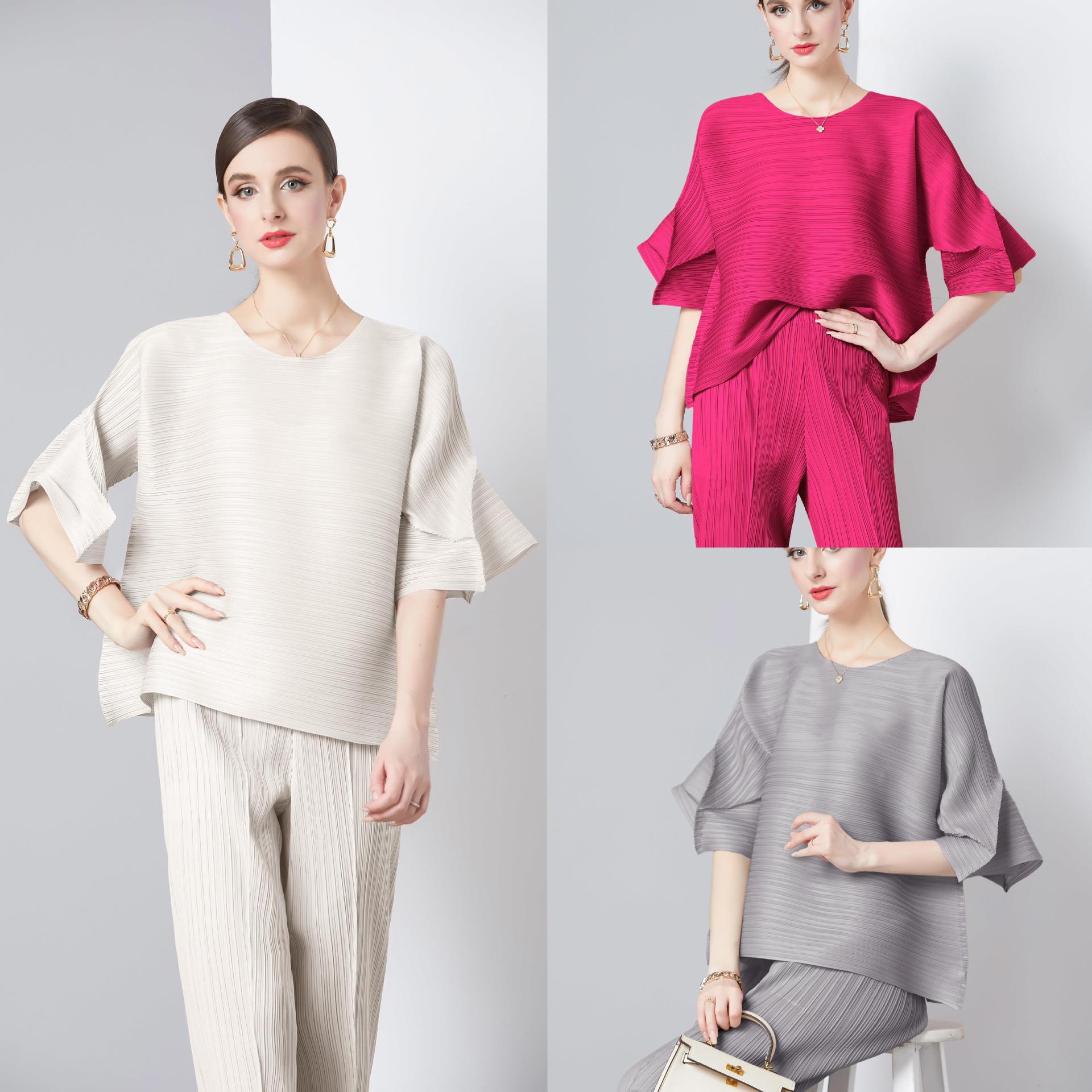 三宅のしわの不規則なデザイン感の丸首は簡単に上着の9分のズボンの純色の夏の垂感のスーツをつなぎます。