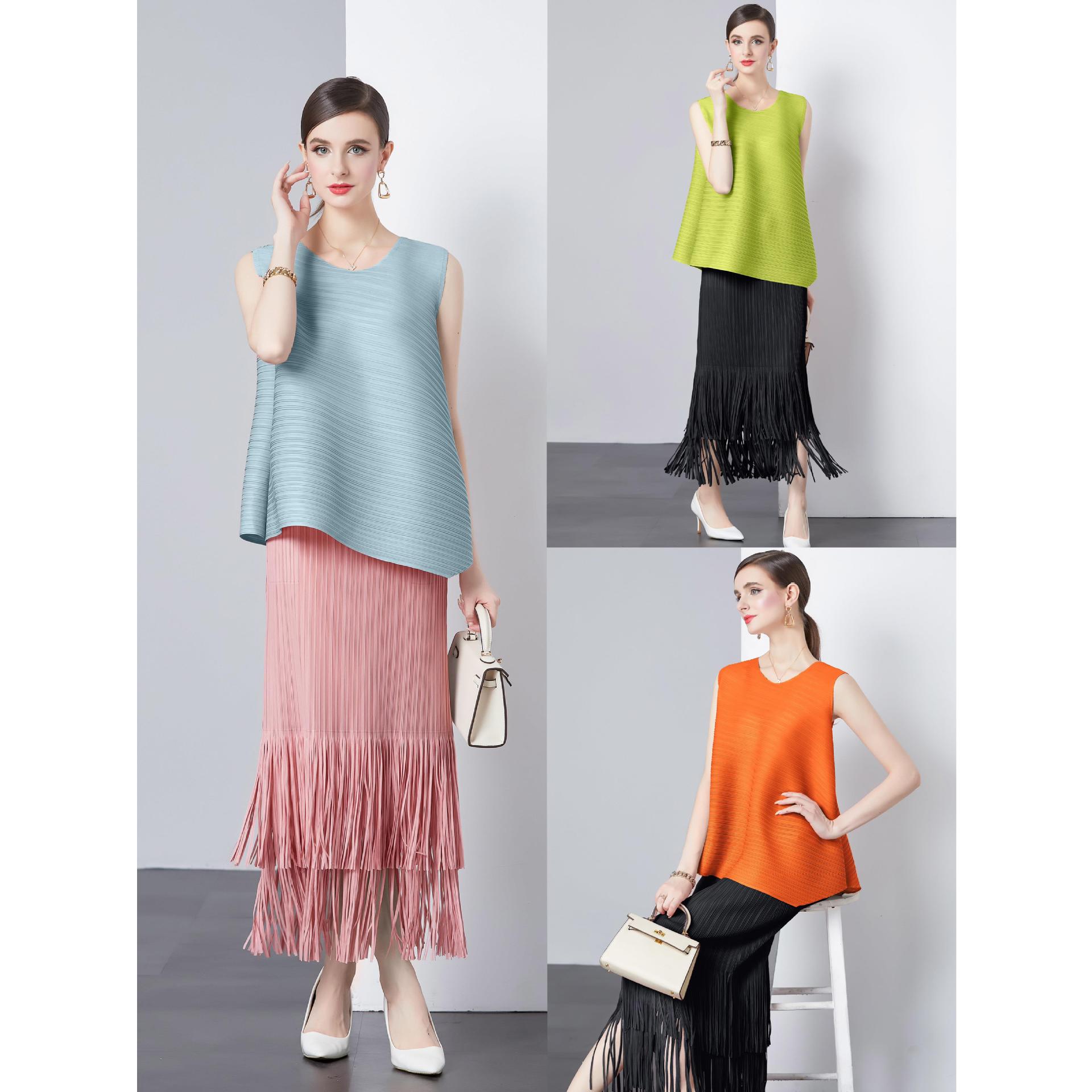 2024夏に痩せたa字の袖のない純色ベストのしわtシャツ + ボディスーツのヒップスカートの2つのセットの女性
