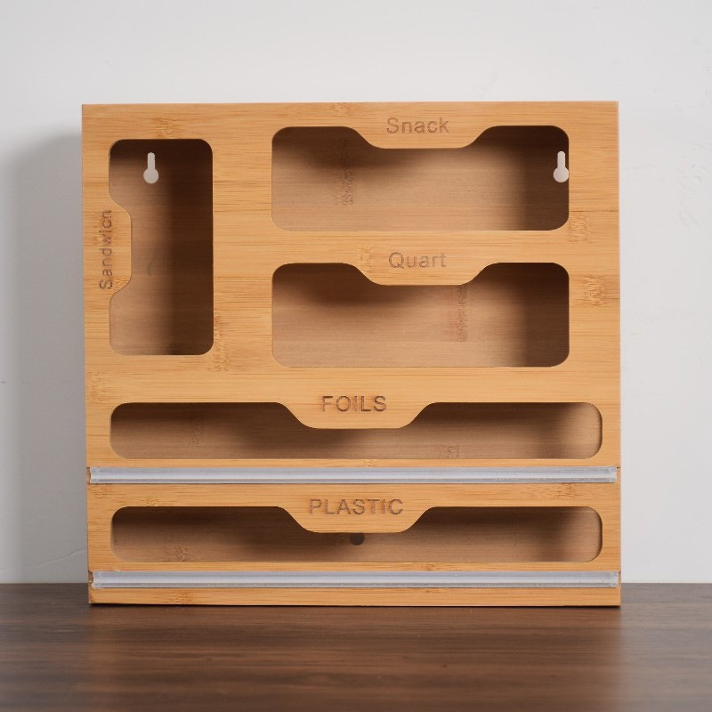 竹製引き出し式ラップ収納棚キッチン壁掛け式保存袋ホルダー