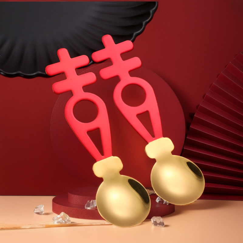 クリエイティブステンレス鋼スプーン中国風レッドダブルハピネススプーンラウンドスプーンウェディングデザートスプーン囍スプーン結婚式のお土産ギフトスプーン