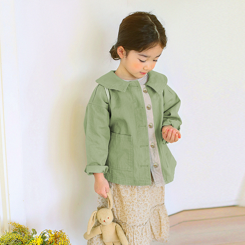 女の子ウォッシュコットン長袖ジャケットショートソリッドカラーラペルダブルポケットデザインかわいい春と秋の防風カーディガントップ