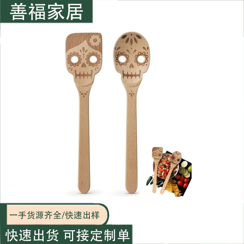 国境を越えた木製スカルスプーン ハロウィンキッチン用品 家庭用キッチン食器 長柄竹スプーンセット クリエイティブレーザーブナ材