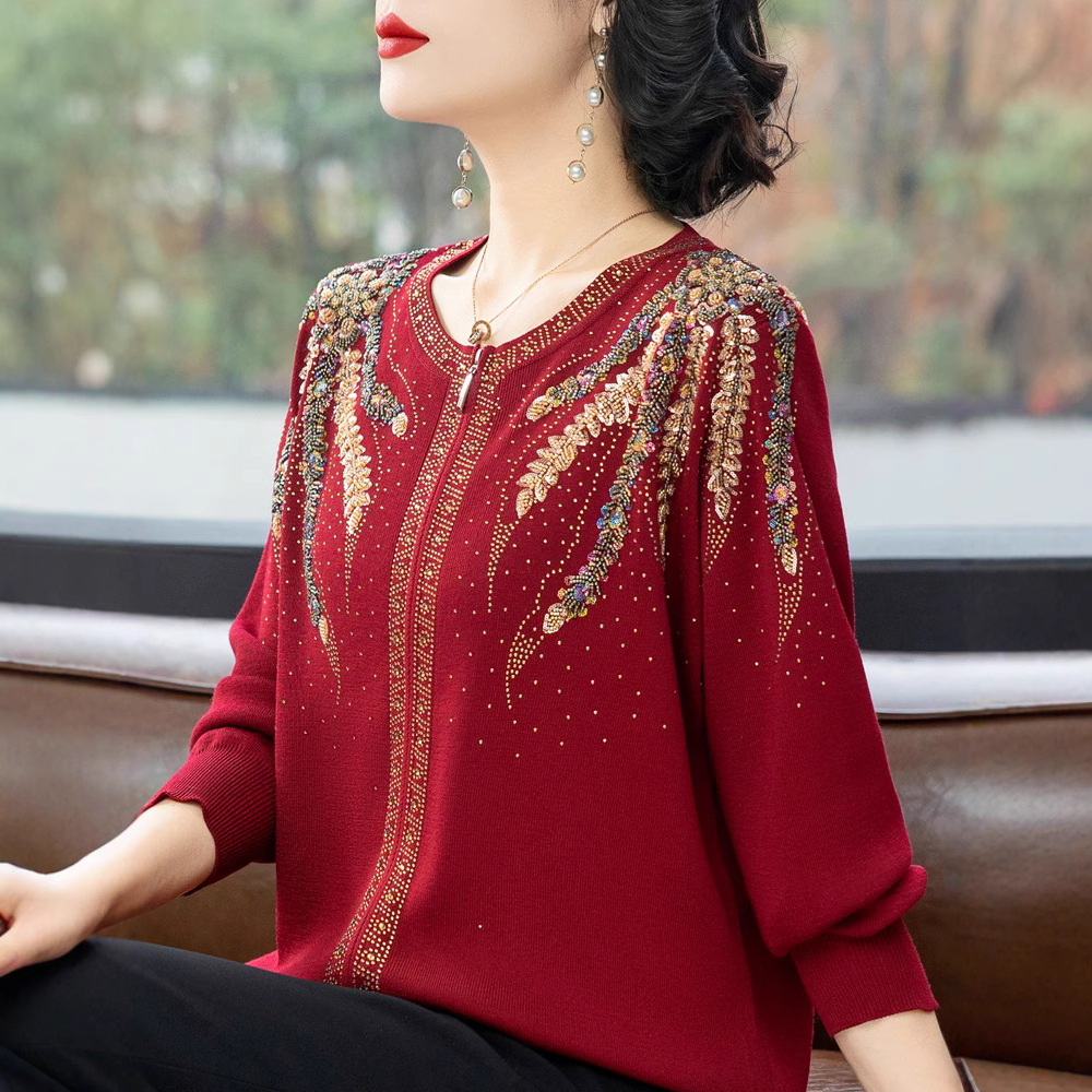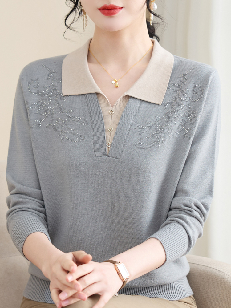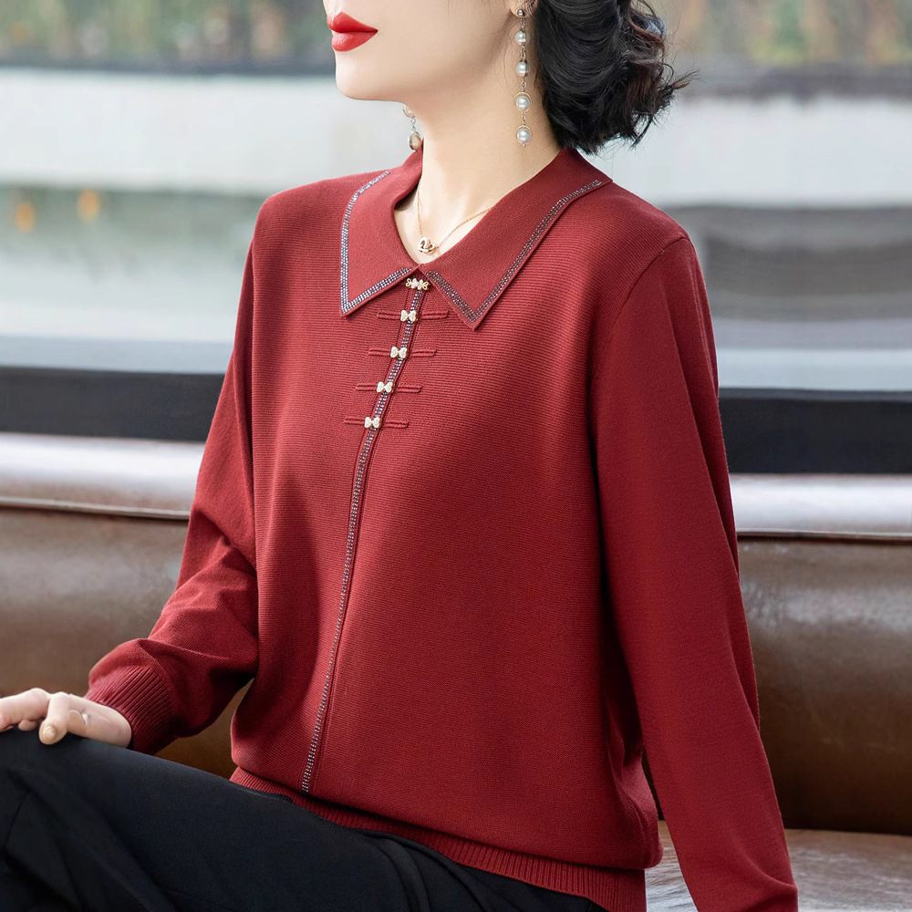 お母さんの春の服の長袖のニットは底の小さいシャツの2024の新型の中高年の女性の春秋の洋風のセーターのファッションのスーツを打ちます。