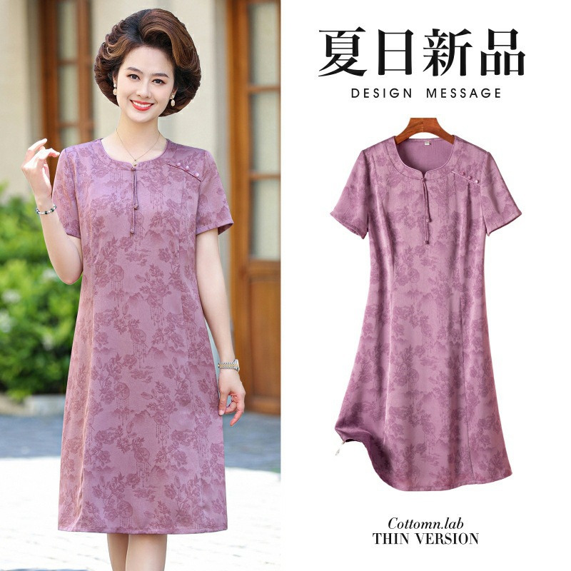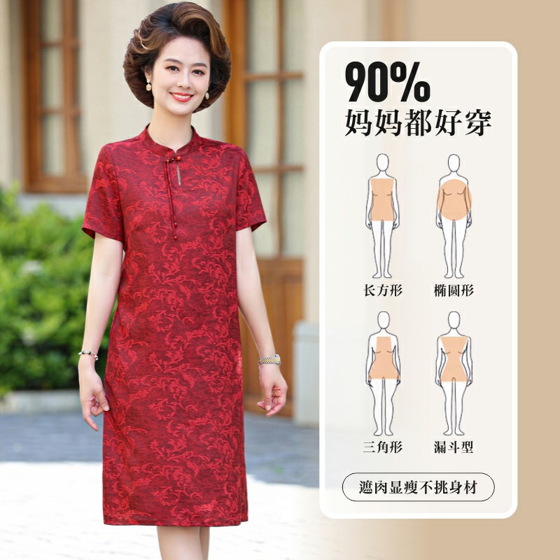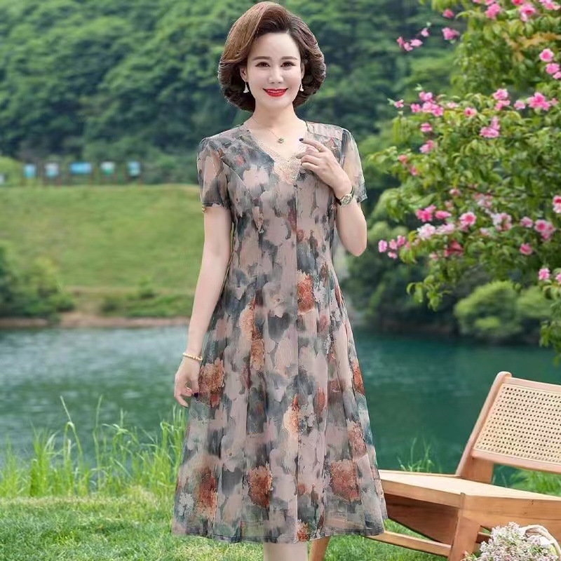 母の日のお母さんの洋風のワンピースの中年の女性の夏服の2024新型の中高年の気質の半袖のシフォンのスカート