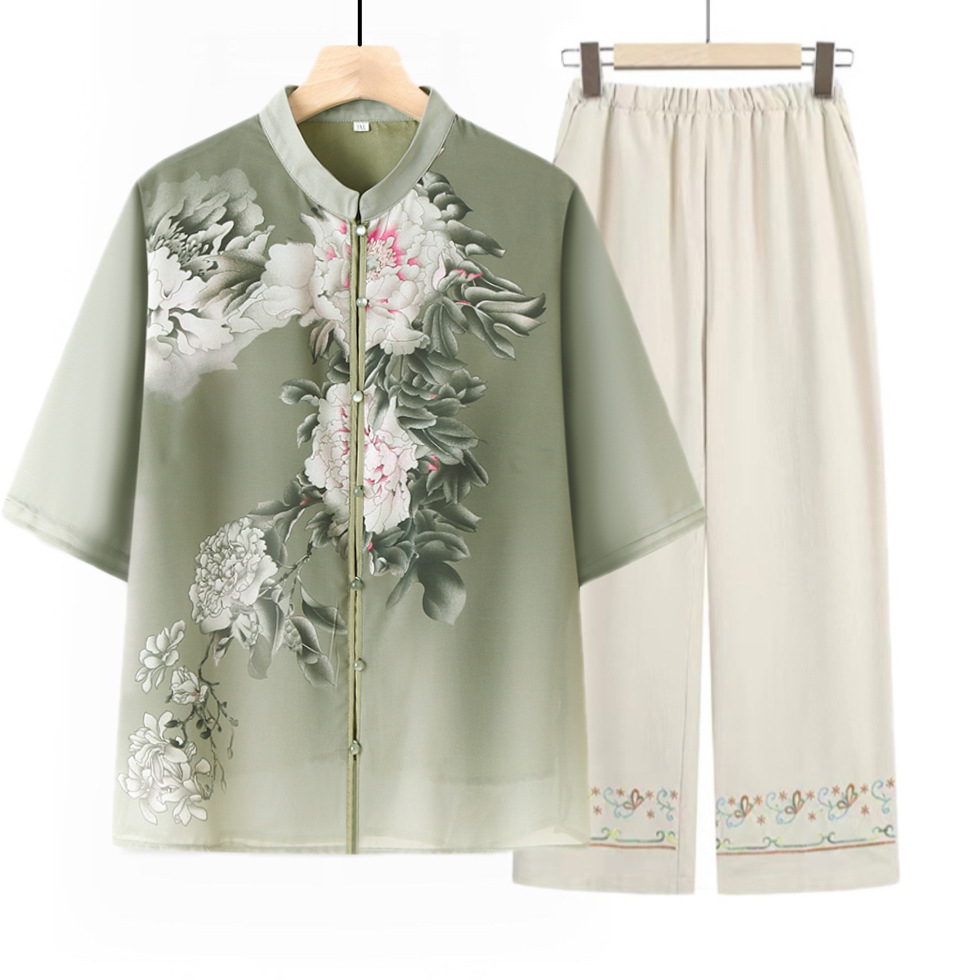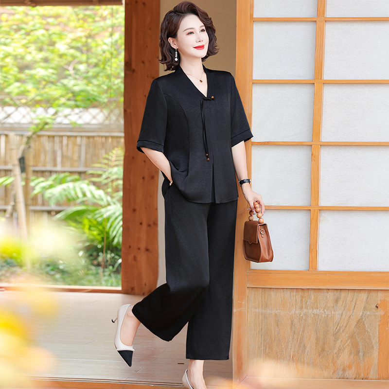 中高年のお母さんのシルクのスーツの夏の新型の国風の純色の新しい中国式のファッションの上着の広い足のズボンの2つのセット