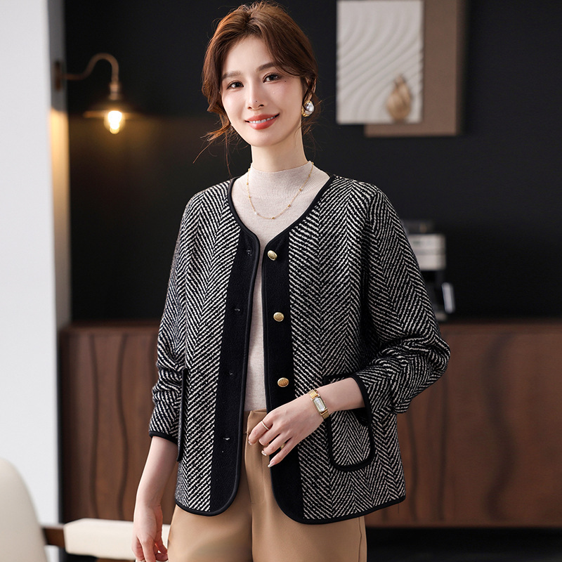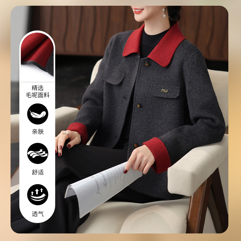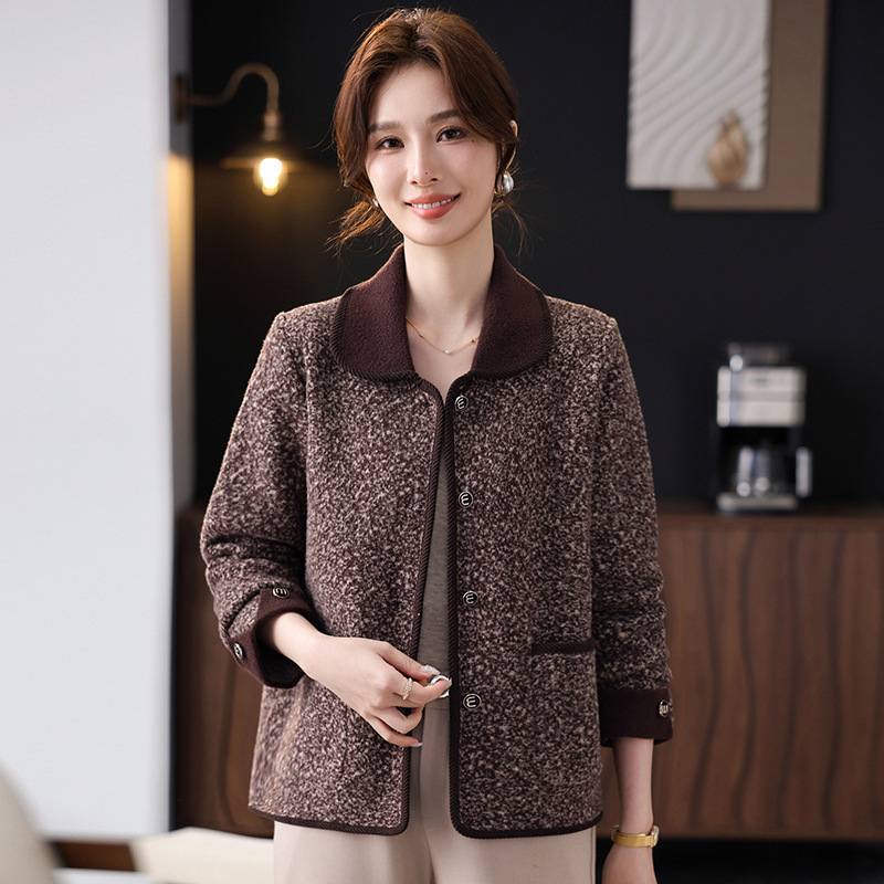 お母さんの春の服の2025の新型の小さい香の風の毛はコートの中で老年の婦人服の両面です。