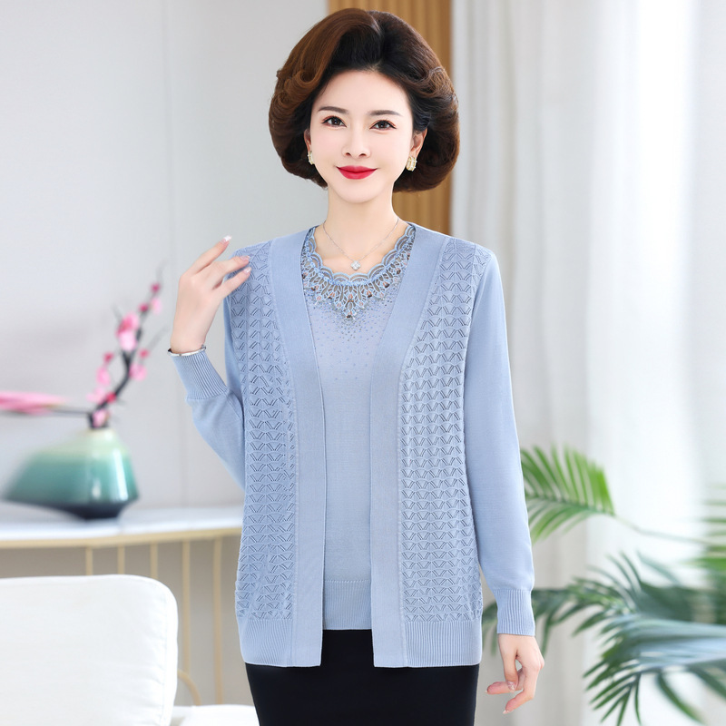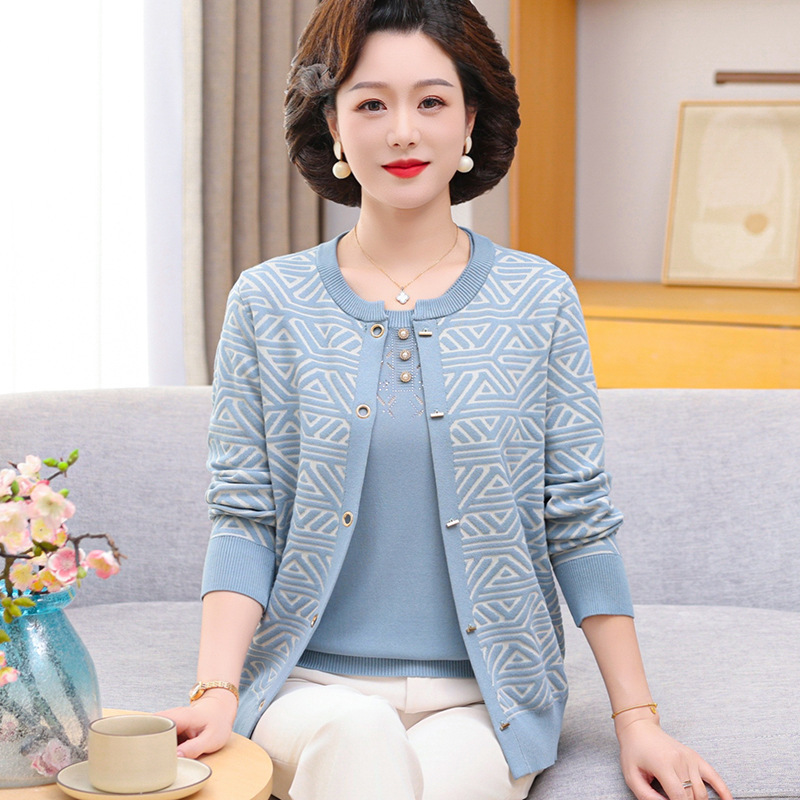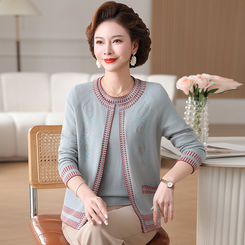 お母さんの春の服2025新型の洋風の気高い襟の上着の中で年配の女性の春と秋の短い編みのカーディガンの上着