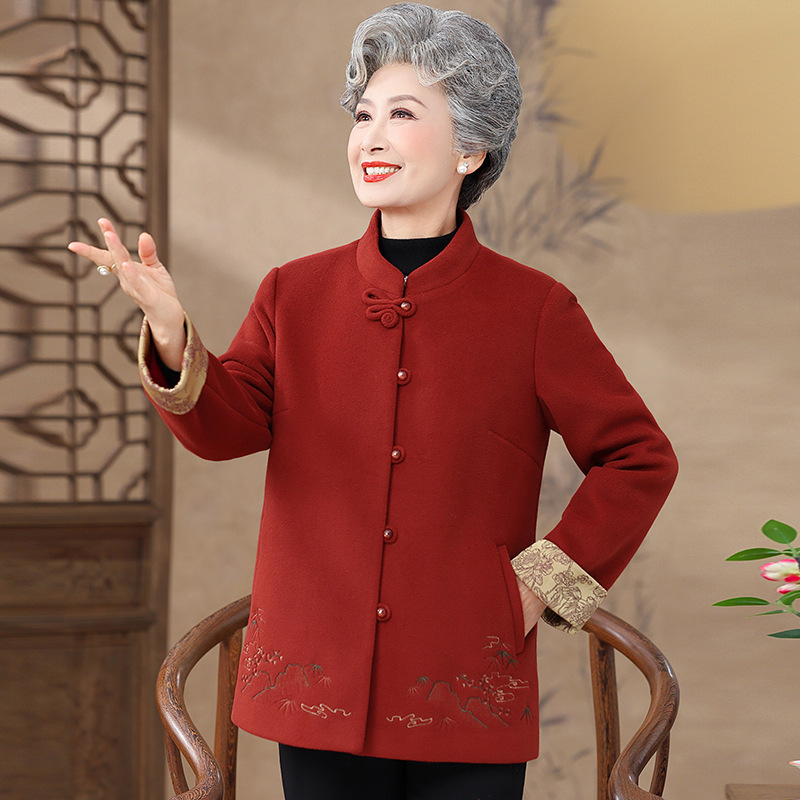 おばあさんの新しい中国式のコートの高齢者の婦人服の毛は上着の春秋の気質のお母さんのラシャのジャケットのおばあさんの服です。