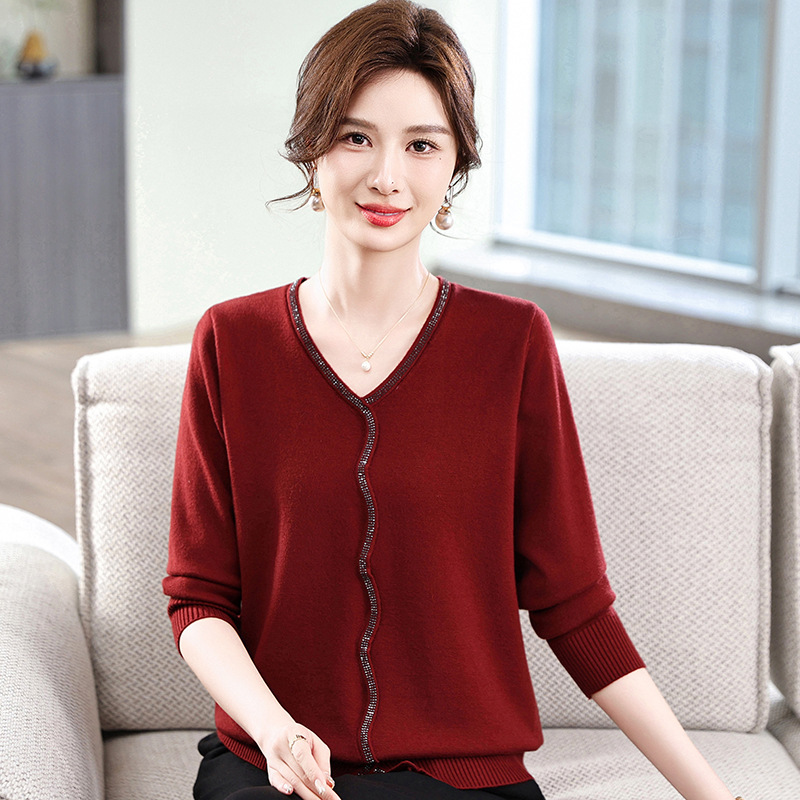 お母さんの新年の服の早春の上着の2025新型の赤いセーターの中で老年の女性の気質の底のシャツの長袖のtシャツ