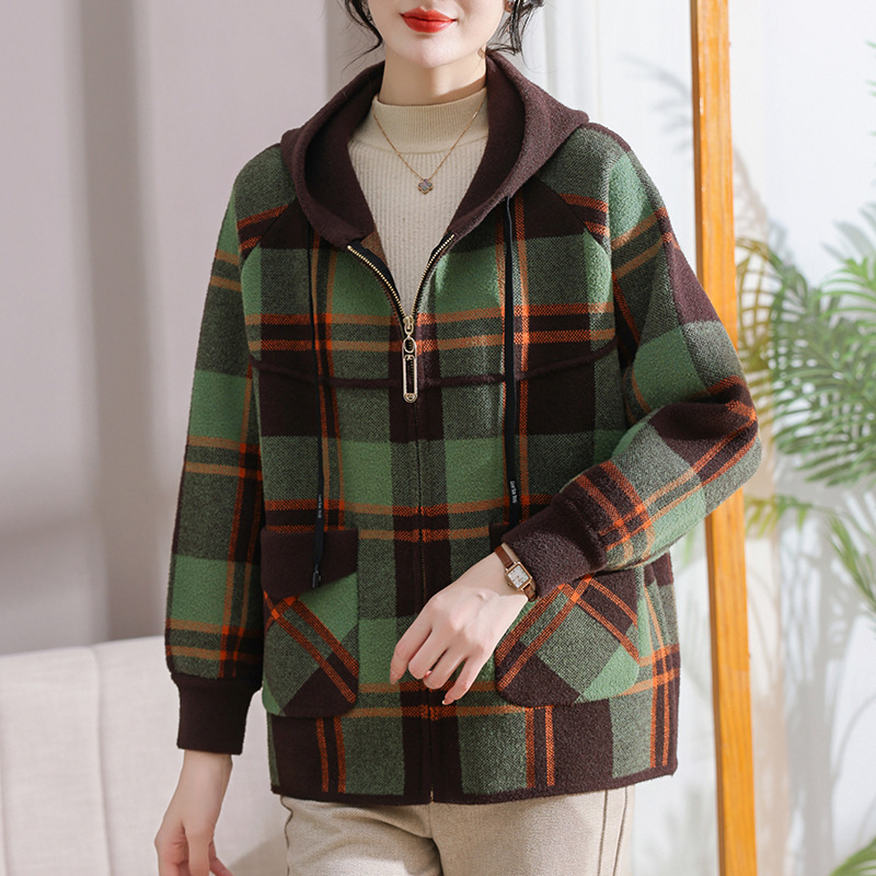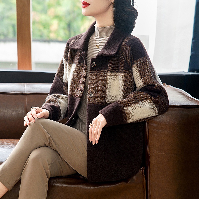 お母さんの春服のコートと帽子のニットの上着の中で老年の春と秋の短いカーディガンのジャケットの中年の格子の服