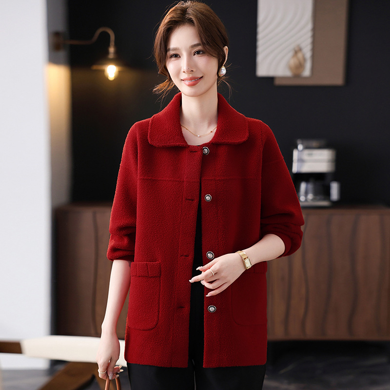 40歳の50歳のお母さんの春の服の毛のコートの新型の赤いコートの中高年の婦人服の春秋は襟のゆったりしている上着をひっくり返します。