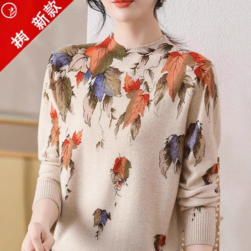 洋気のお母さんは100カシミヤのシャツの女性の丸首の大きいサイズの秋冬の新型のプリントのウールを着て底を打ってやせているセーターを現します。