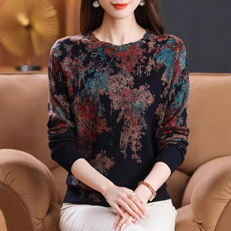 高級ブランド丸首レトロプリント100% ウールシャツ民族風弾力ニット上着秋冬ゆるいセーター