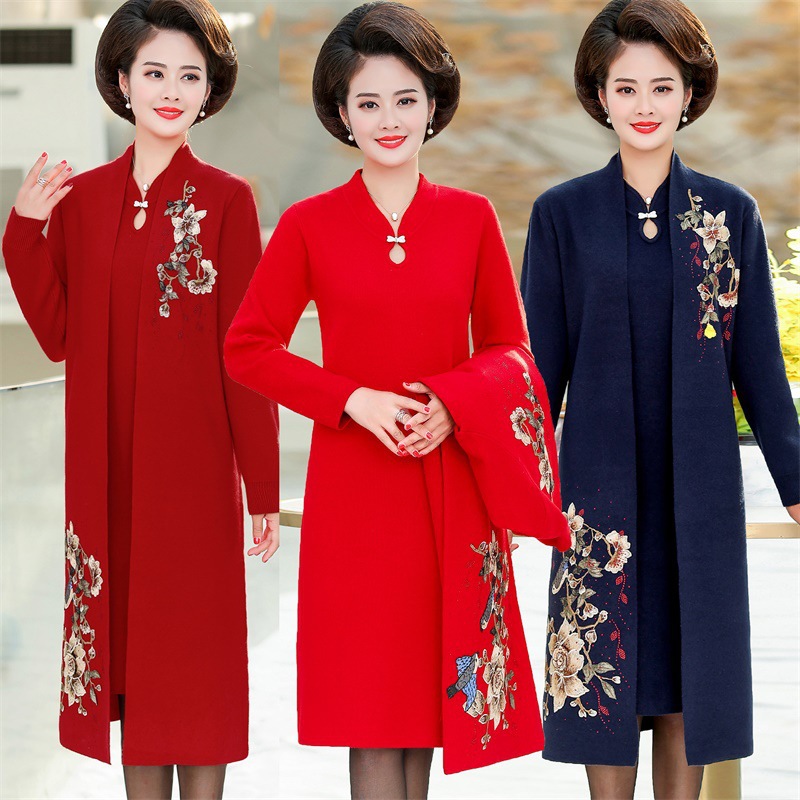 お母さんの秋冬の披露宴の服のスーツの中で老年の婦人服の喜姑のウェディングドレスの2つのセットの中で長いタイプの刺繍のコート