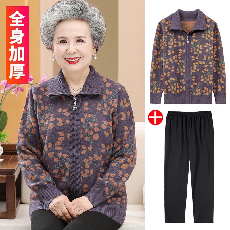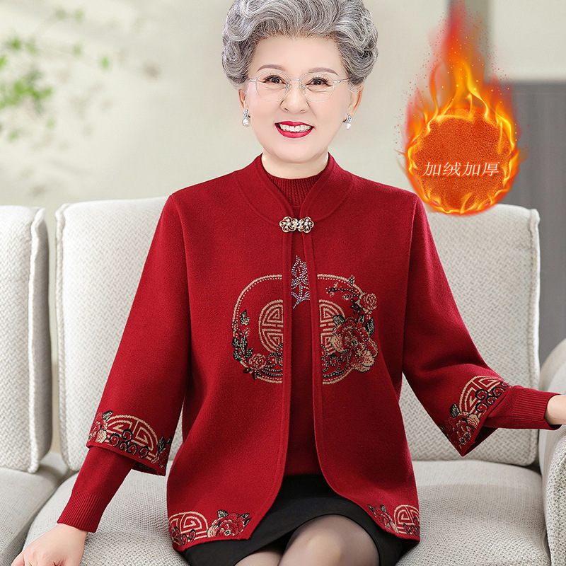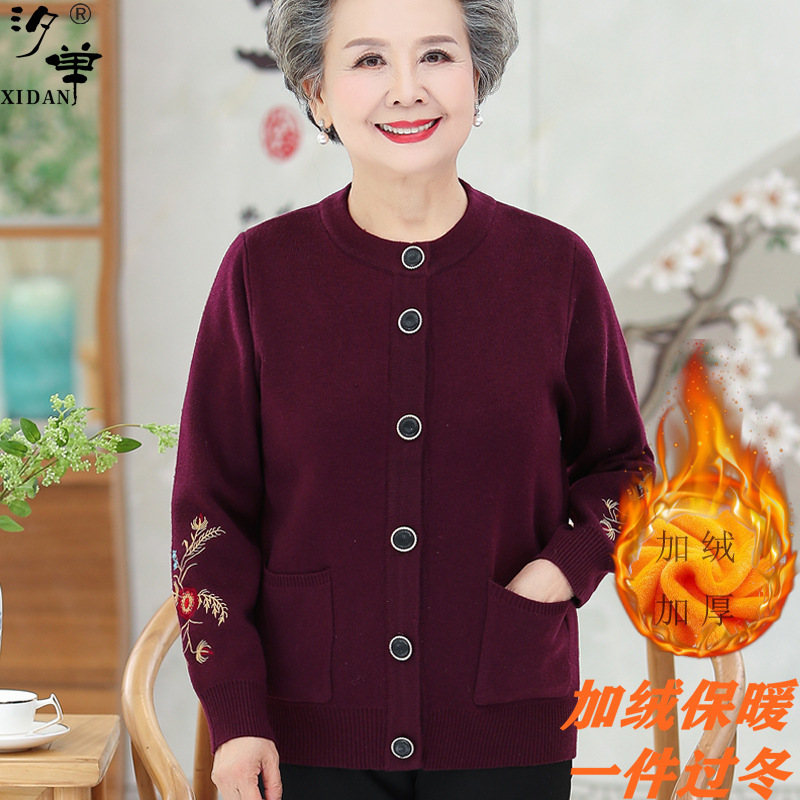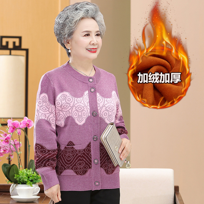 高齢者の秋装羊のセーターのコートの女性は70歳の80おばあさんの上着のお母さんの秋冬にベルベットの厚いカーディガンを着ます