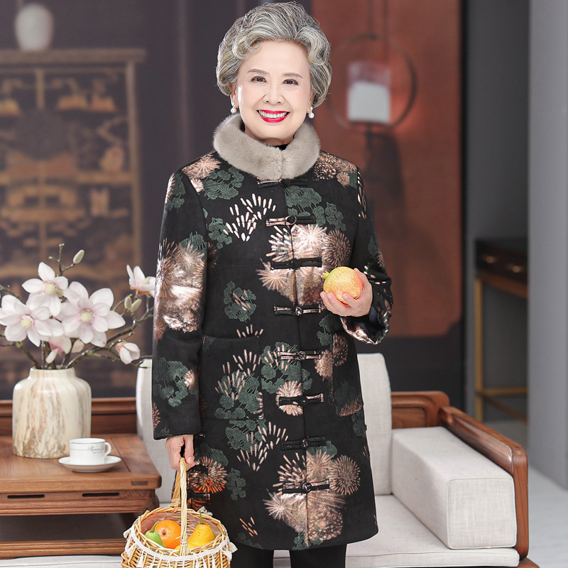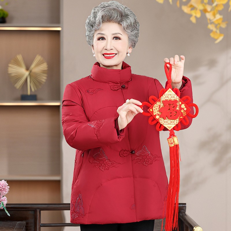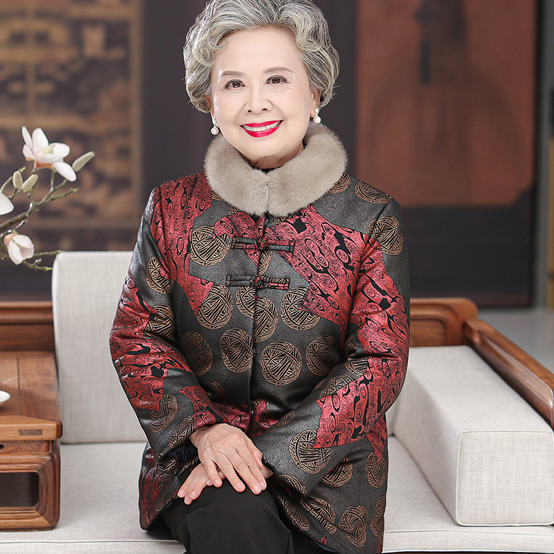 80歳の大寿服の女性のおばあさんのダウンジャケットのお祝いの中高年の冬服のコートの老人の誕生日の唐服のウェディングドレス