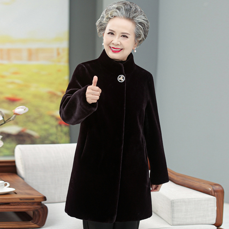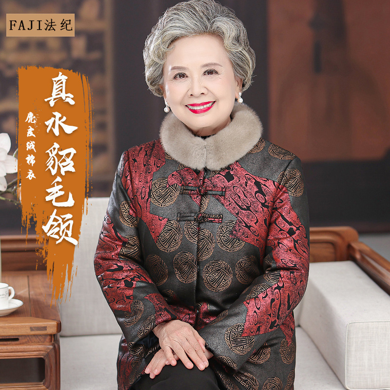 中高年の冬服の女性のおばあさんは本当にミンクの毛の襟の綿服の上着のお母さんは冬のスエードの綿服の気高い服を詰めます。