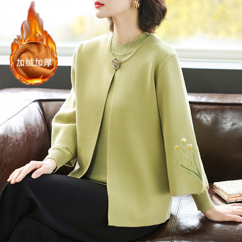 中高年婦人服秋服洋風カーディガンコート中年お母さん秋冬ビッグサイズ上着ベルベットニット2点セット