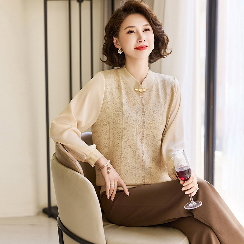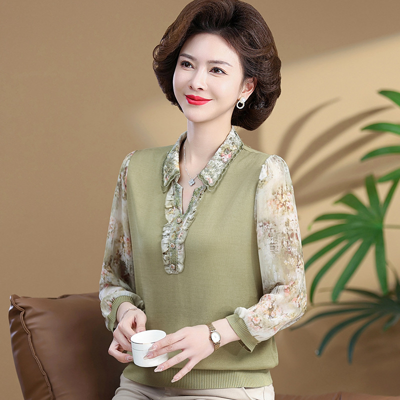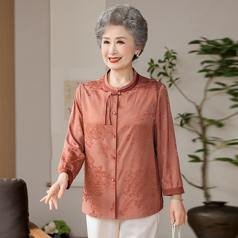 ママの春の薄手の気質シャツ、中年女性のファッショナブルなガーゼスリーブトップス、中高年の春と秋のスタイルのボトムシャツ