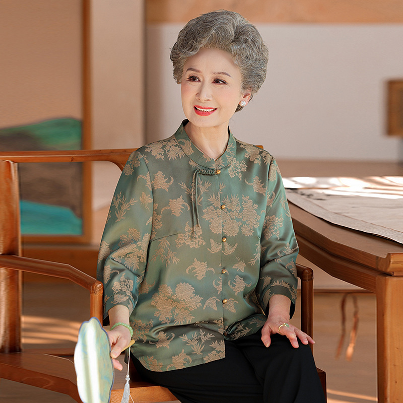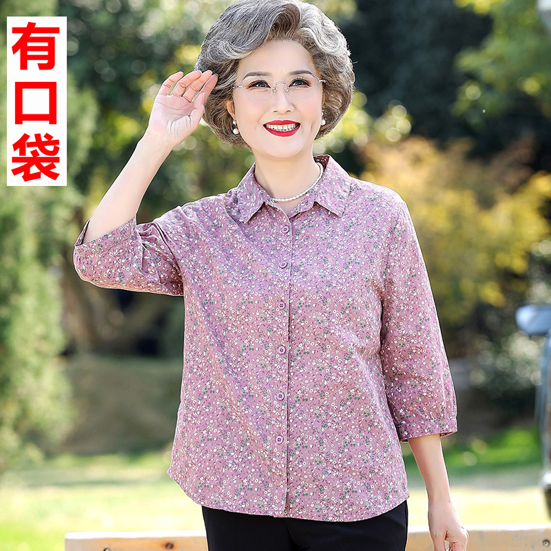 おばあちゃんの春のシャツ、高齢女性の新しいスタイル、ラウンドネックの洋風シャツ、9分袖、おばあちゃんの夏服