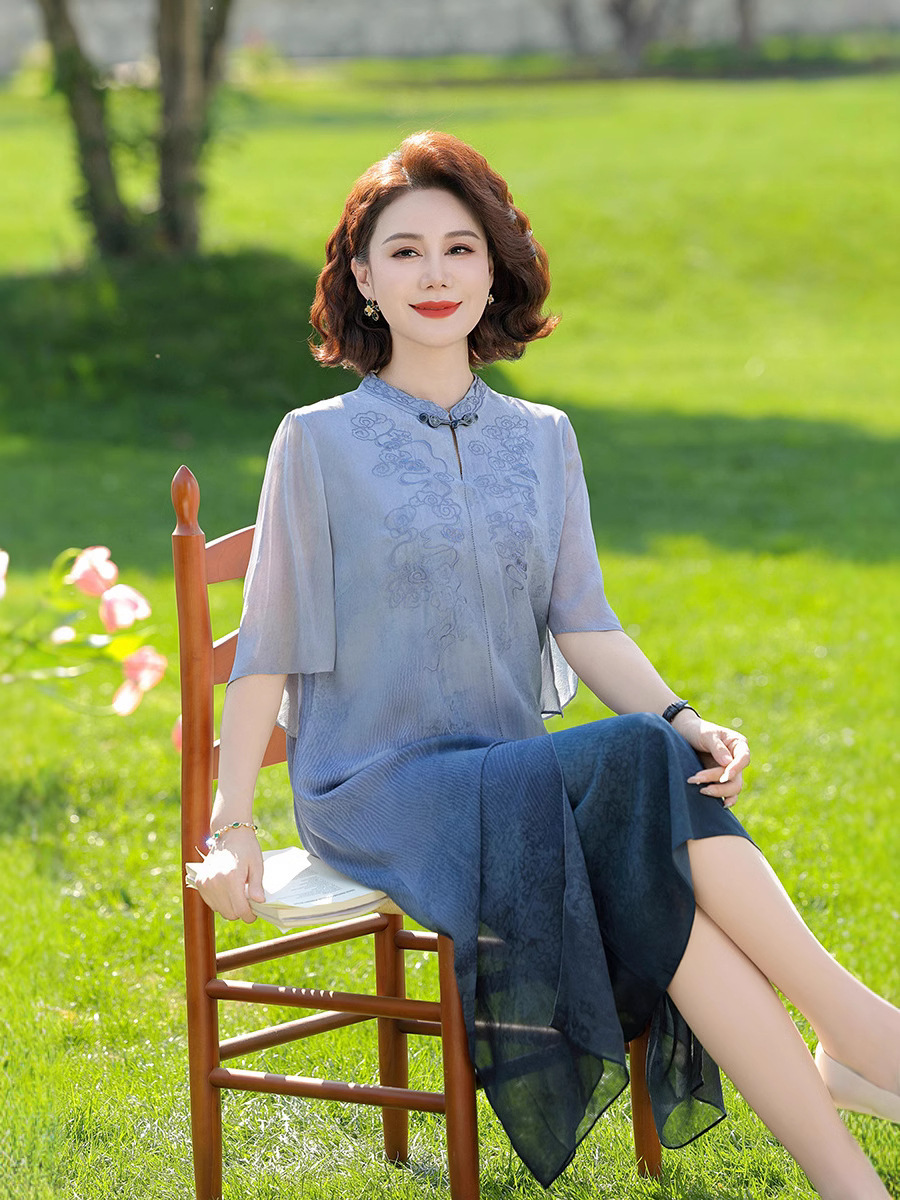 中高年のお母さんの夏服の新型の绢糸のシャツの女性のおばあさんの国风の上着のファッションのおばあさんのシルクの小さいシャツ