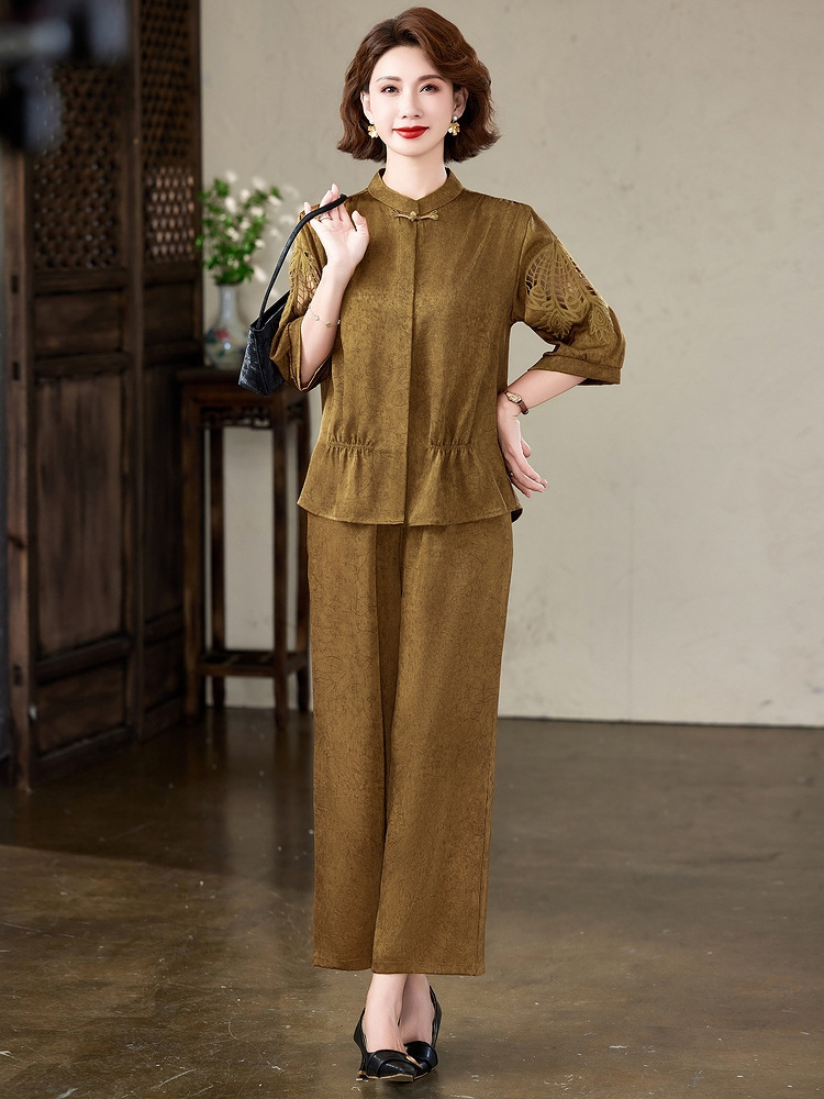 中高年のお母さんのシルクのスーツの夏の新型の国風の純色の新しい中国式のファッションの上着の広い足のズボンの2つのセット