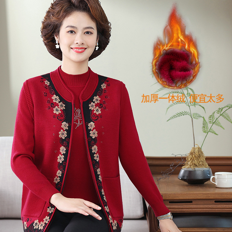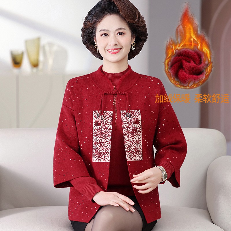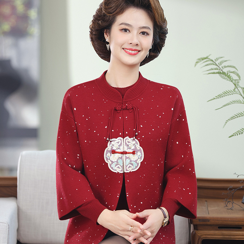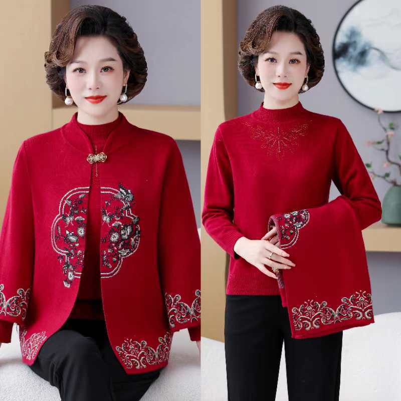 お母さんのニット二点セットの本命年の赤いセーターのおばあさんの秋のカーディガンの中年女性のカーディガンセット