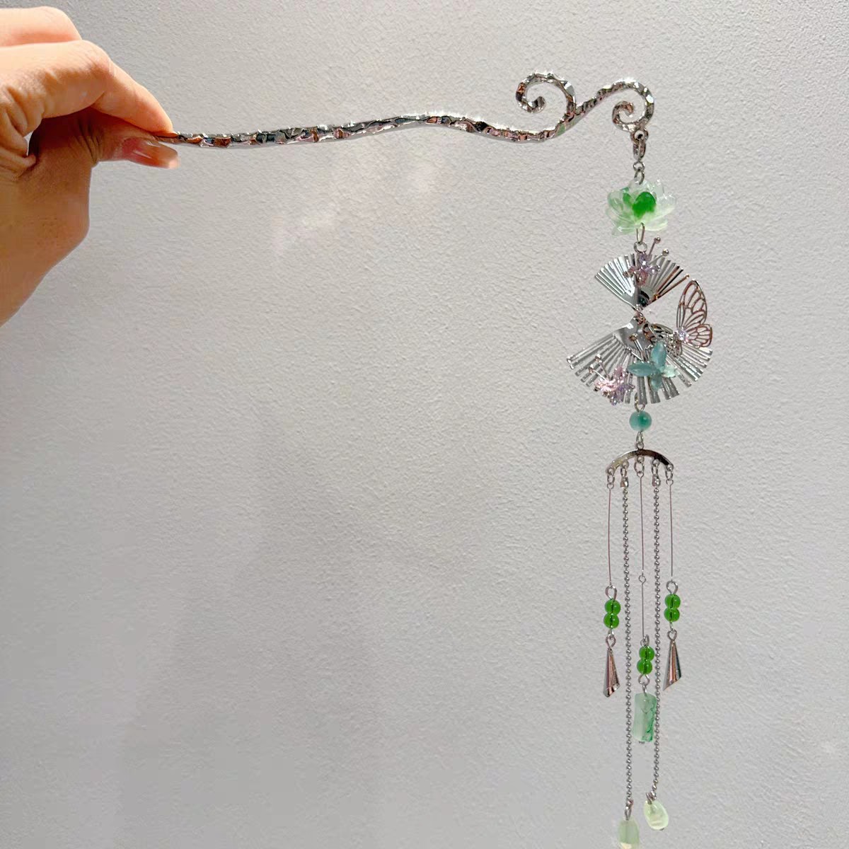 新中国式緑扇子流蘇髪かんざし仙気国風小衆設計清冷感詩情扇意歩揺髪飾り女