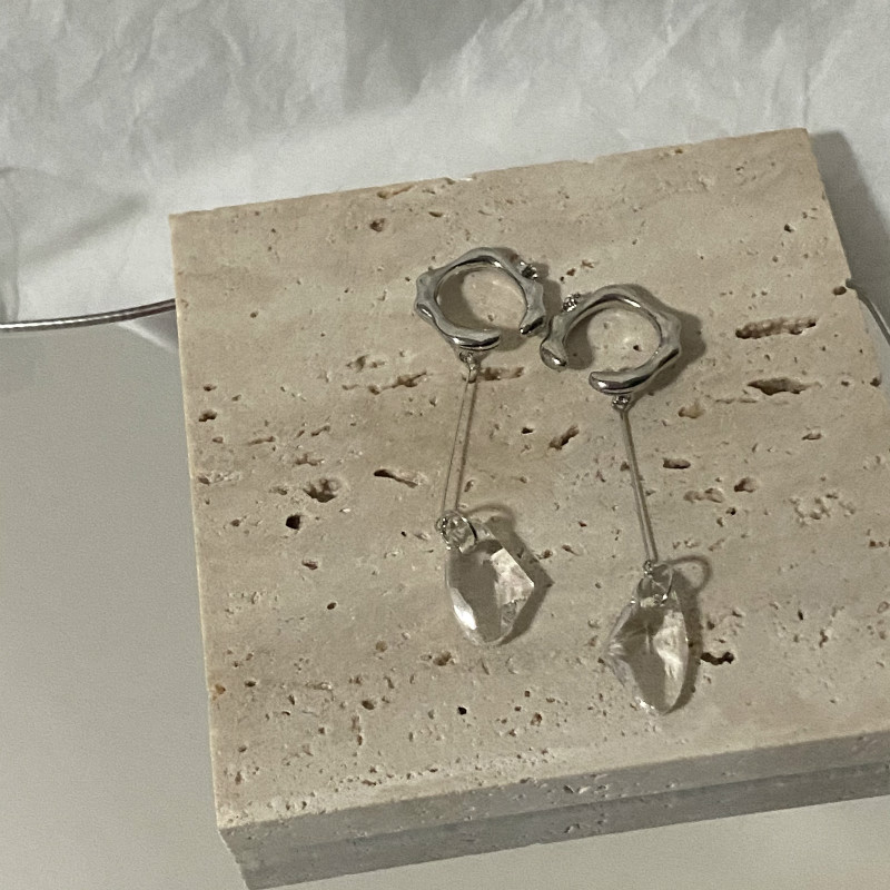 小紅書ins小衆流行銀色冷淡風不規則カット水晶長型耳クリップ耳穴なし耳ペンダント