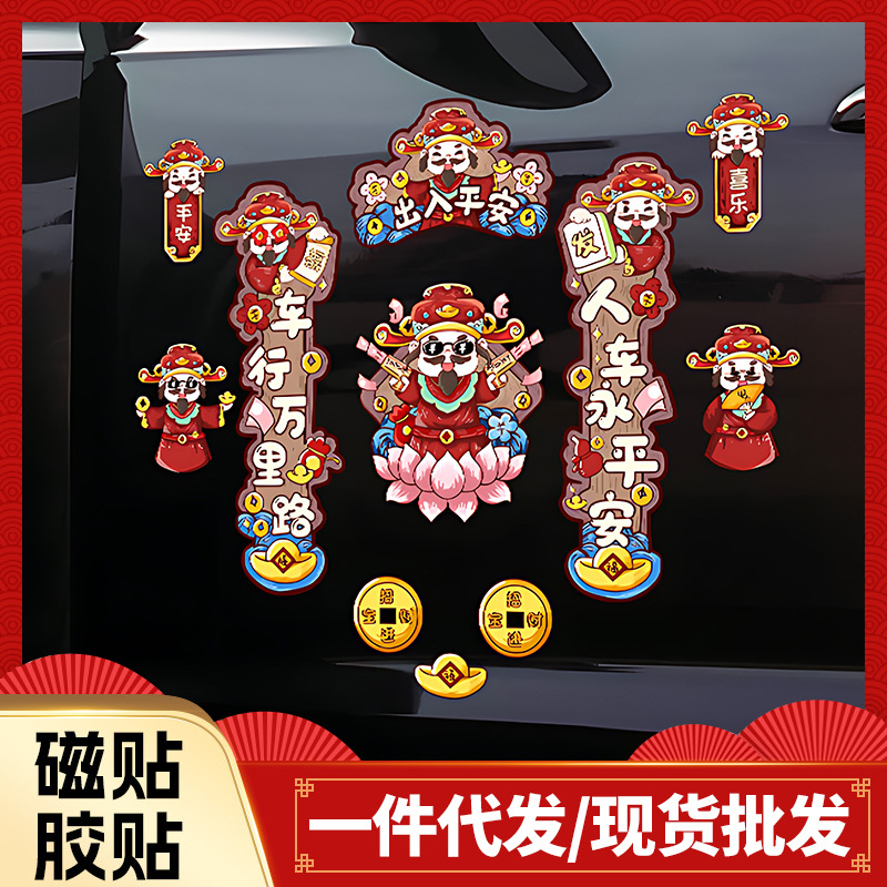 自動車財神爺磁気吸引対聯車貼り2025旧正月新年磁石車対聯招財猫車対