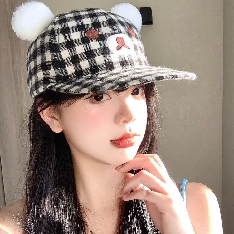 かわいい高颜値リラックマ耳白黒格子鸭舌帽の広いつばが顔を見せてカジュアルな野球帽