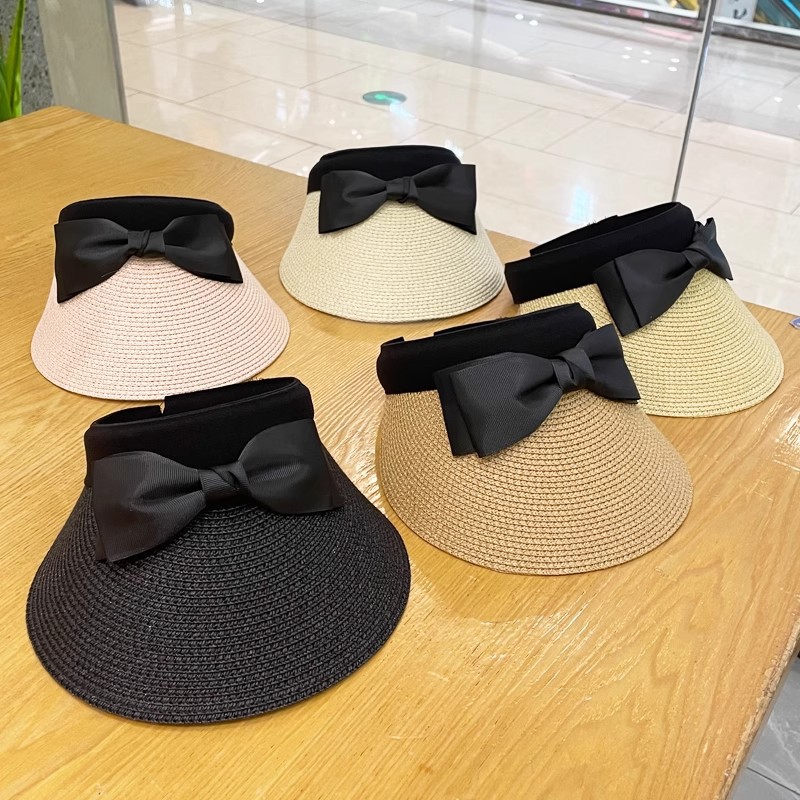 麦わらヘッドバンドサンハット夏中空トップラフィアハット日焼け止めリボンつば広カジュアルアヒル舌サンハット