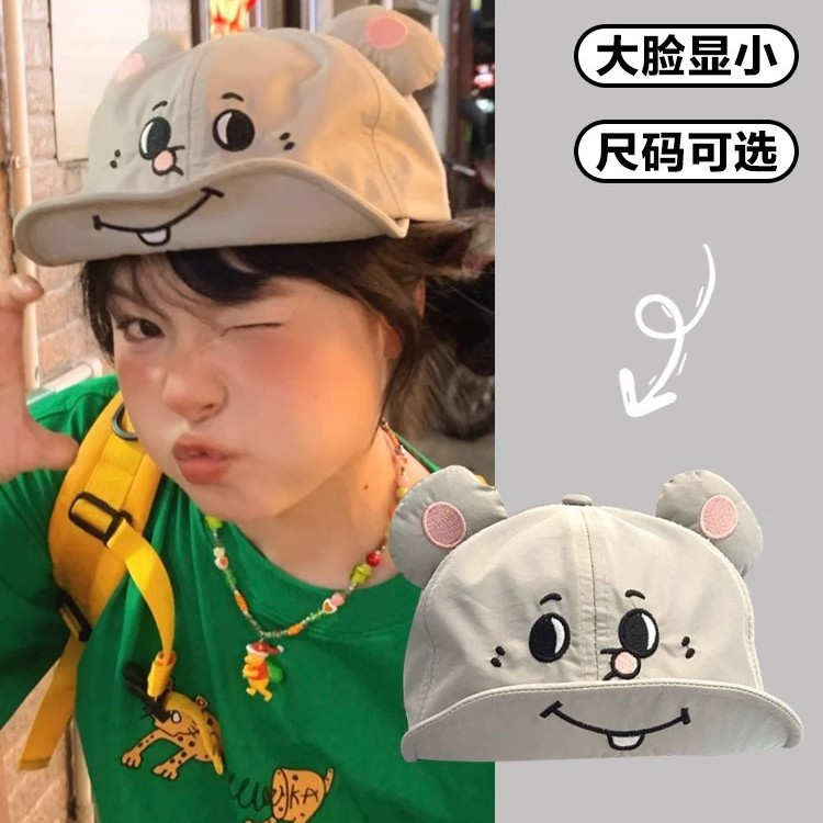 灰色のネズミの帽子がつばをひっくり返して野球の帽子の大きい頭の周りのかわいい漫画の風の日よけの日焼け止めのカジュアルな百合のアヒルの舌の帽子