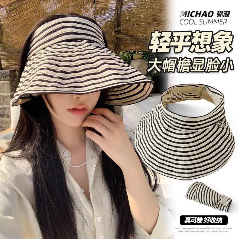 女性用の空のつばのフランスの日よけ帽子、大きなつばの夏の日よけ帽子、クラシックなストライプの折りたたみ可能なシェルハット、UV保護