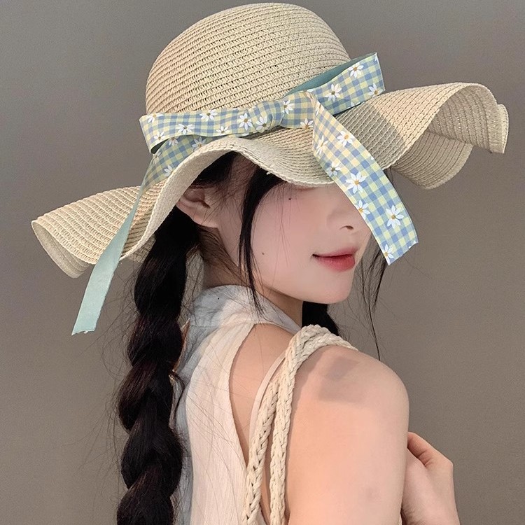 波状のエッジのリボン編み麦わら帽子女性の夏の大きなつば海辺のビーチ休暇日よけ日よけ帽子