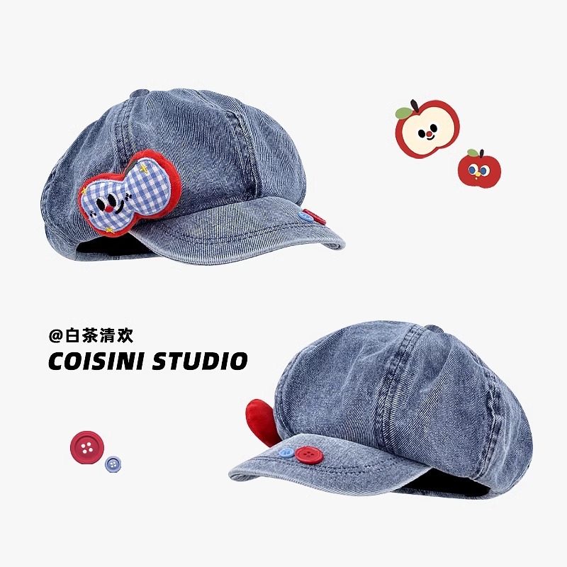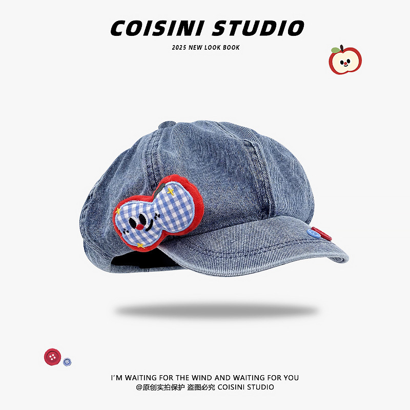 小衆のアップルボタンデニムベレー帽韓系は甘くて可愛いです。