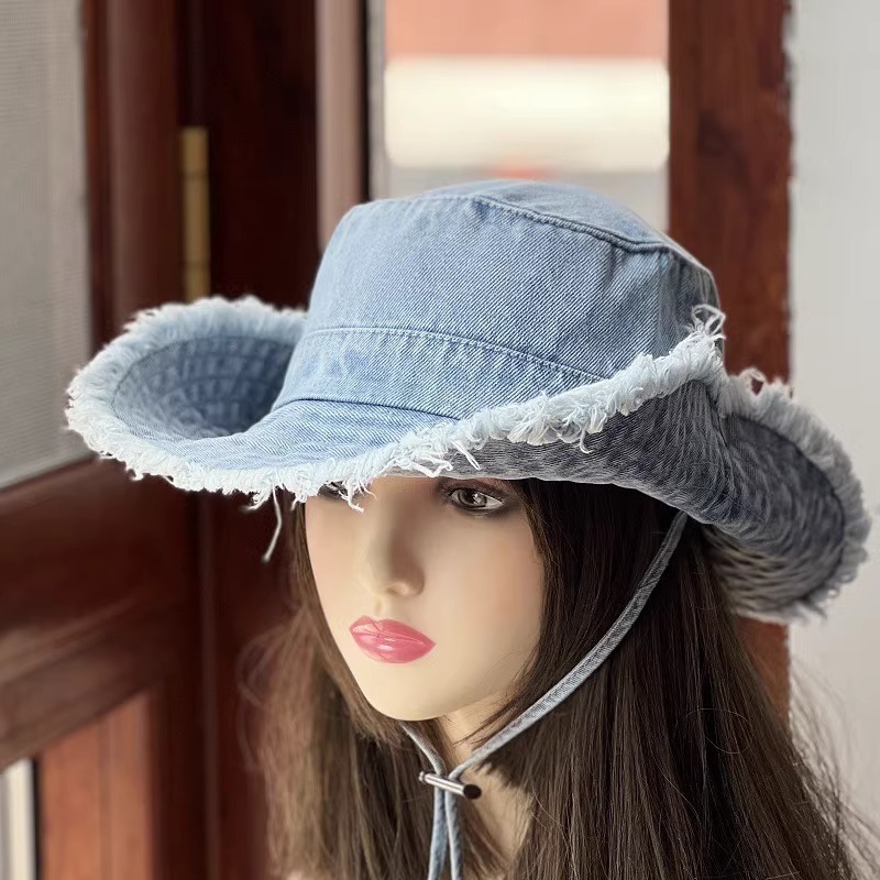 韓国版のレトロなローエッジデニムの大きなつばのフィッシャーマンハット、女性用、夏用の古い屋外用サンシェード帽子、顔が小さく見える