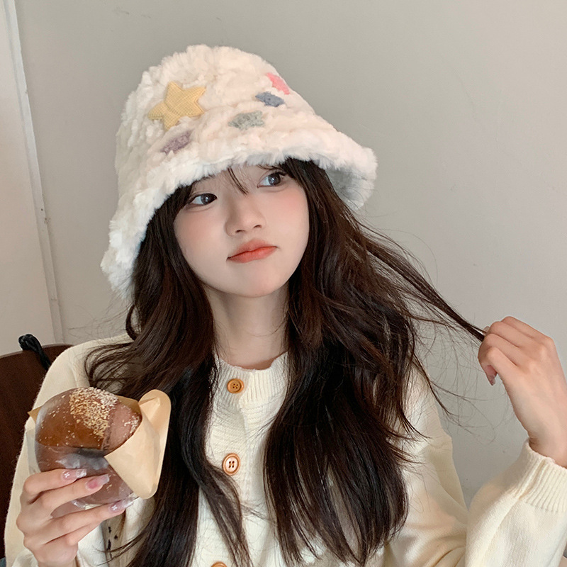 ミルクのフフの子羊の毛の盆の帽子の秋冬の保温の百合の大きい頭の周りの漁師の帽子は顔の小さい毛糸の帽子のぬいぐるみの帽子を現します。