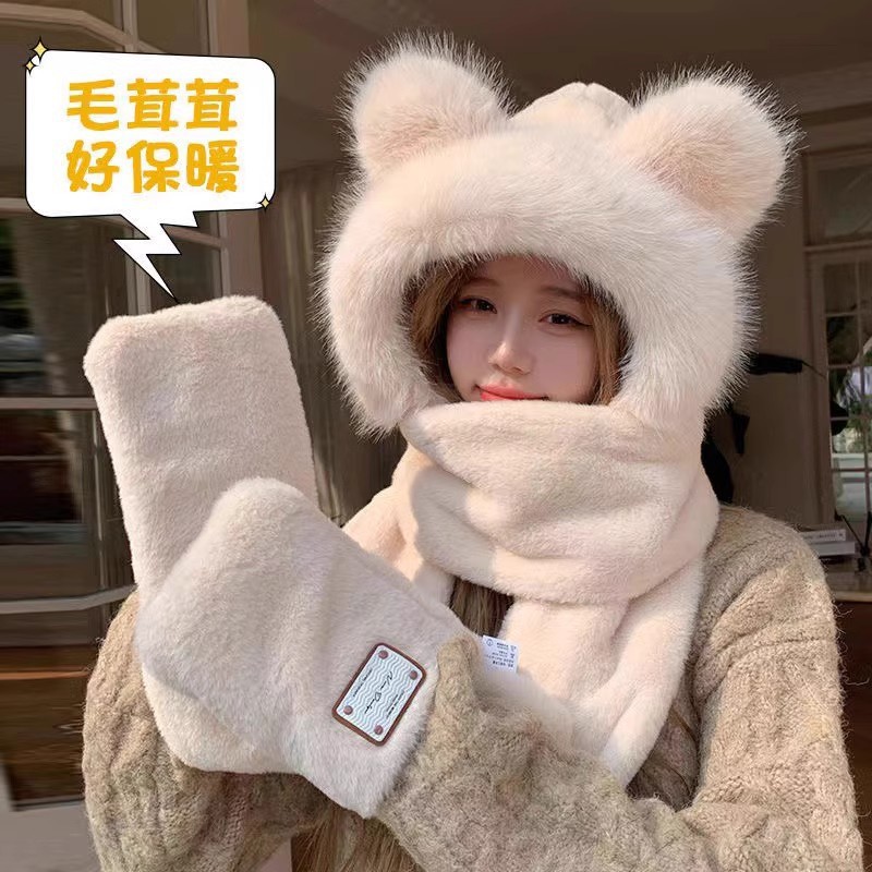 秋冬のかわいい保温アニメの熊の帽子のマフラーの一体の女性のマフラーの厚いファッションのぬいぐるみの3つのセット