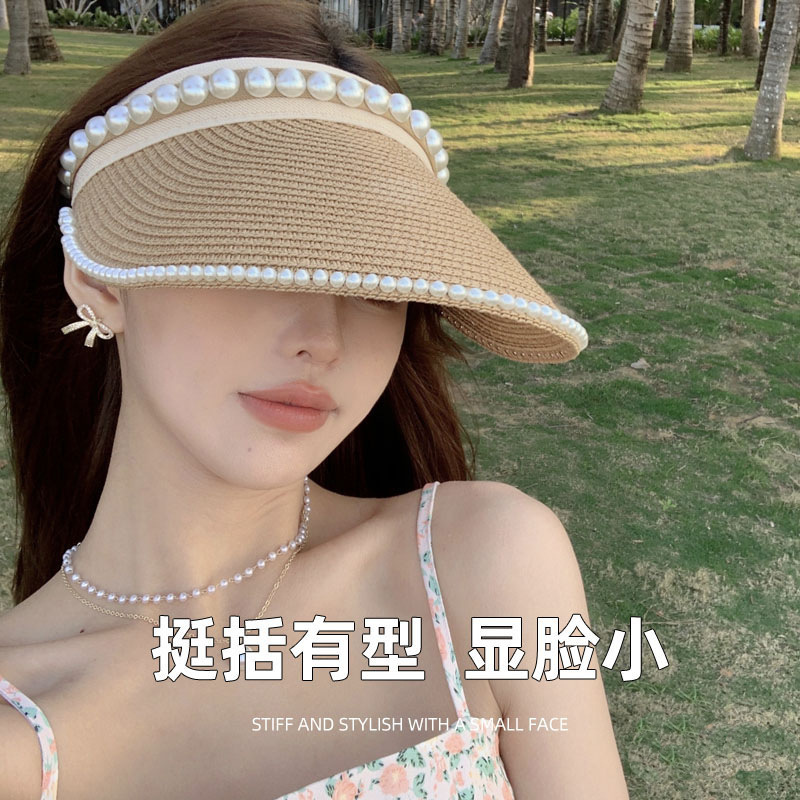 草編み真珠日よけ帽子髪フープ空トップ麦わら帽子女性夏紫外線防止顔日焼け止め太陽帽子女性モデル
