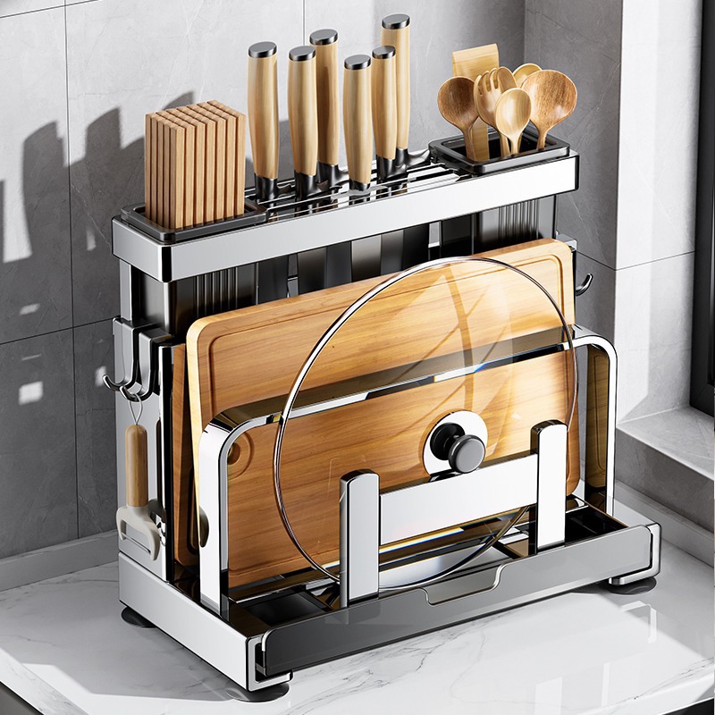 キッチン多機能ステンレスシェルフ鍋蓋ナイフ箸籠一体カッターまな板壁掛けまな板収納棚