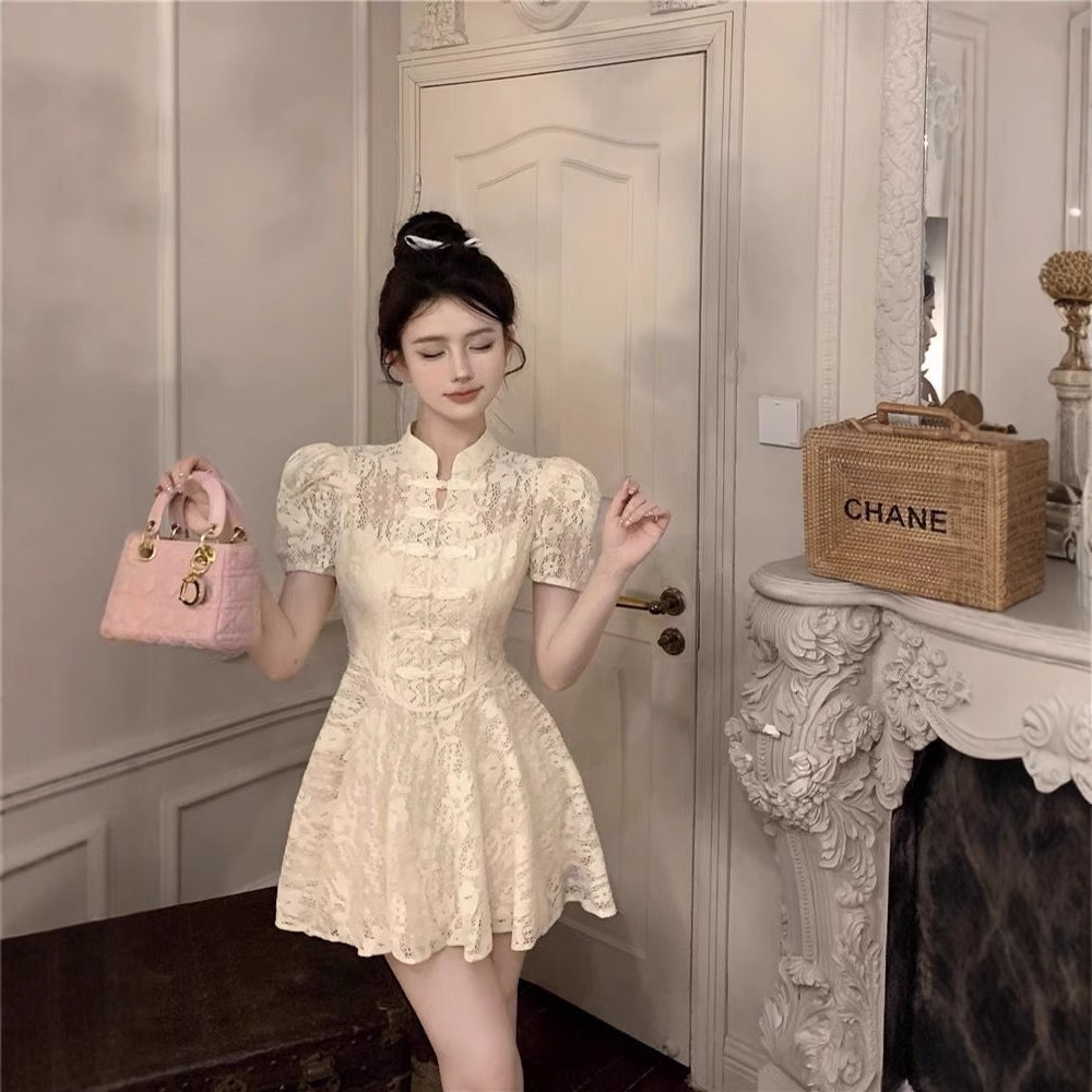 フレンチレトロな新しい中国風の改良されたチャイナドレス女性の夏の新しいウエスト痩身パフスリーブドレス