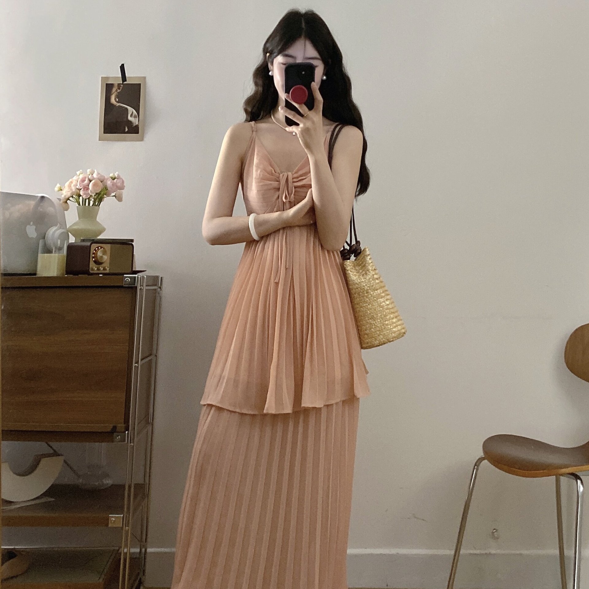 フレンチピンクのシンプルなベストワンピース レディース 2025年夏新作 優しい雰囲気 甘い気質 若見えロングワンピース