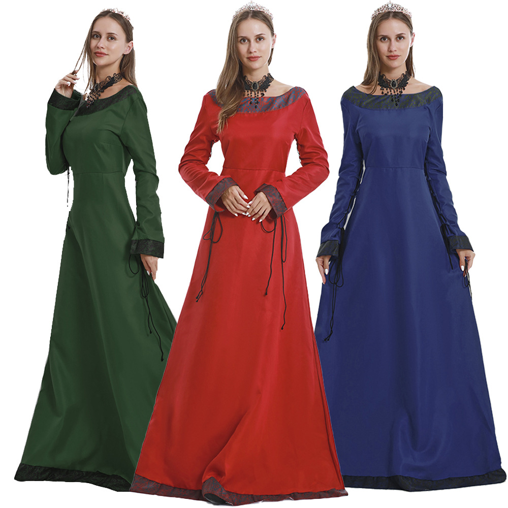 2023年新型欧米宮廷ロングスカート古典中世ヨーロッパ中部長袖丸襟修身女性ワンピース
