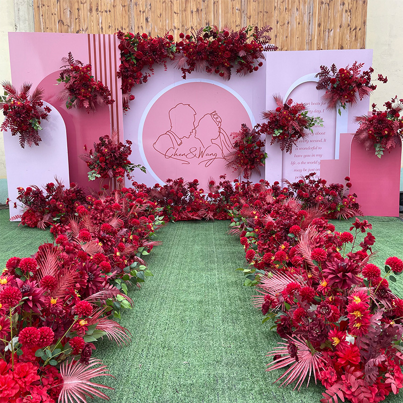 新しい中国式の赤い結婚祝いの花芸の舞台の結婚式の装飾の背景の花の列の花の道案内の配置のシミュレーションの花の組み合わせ